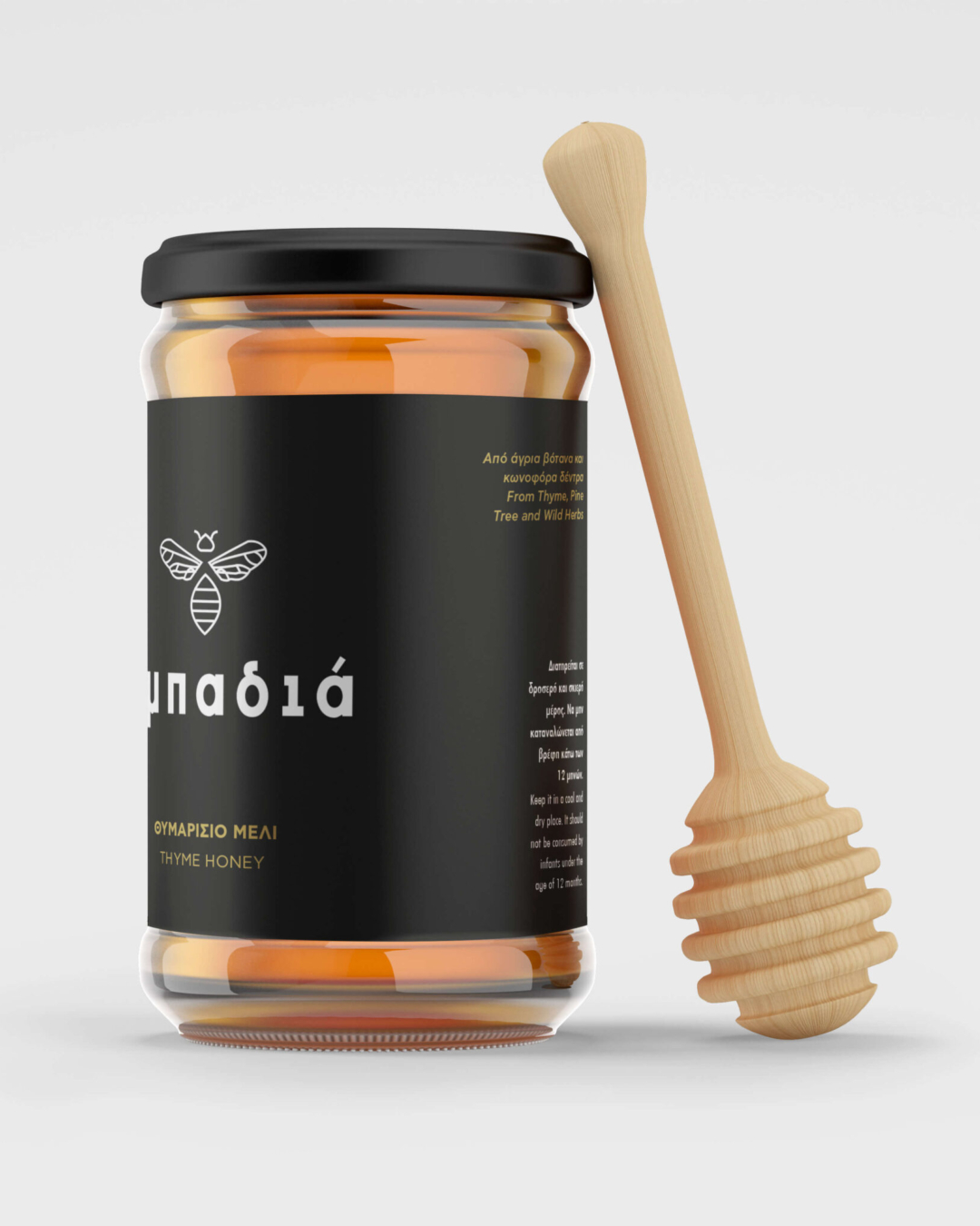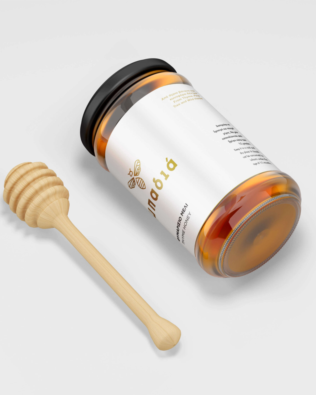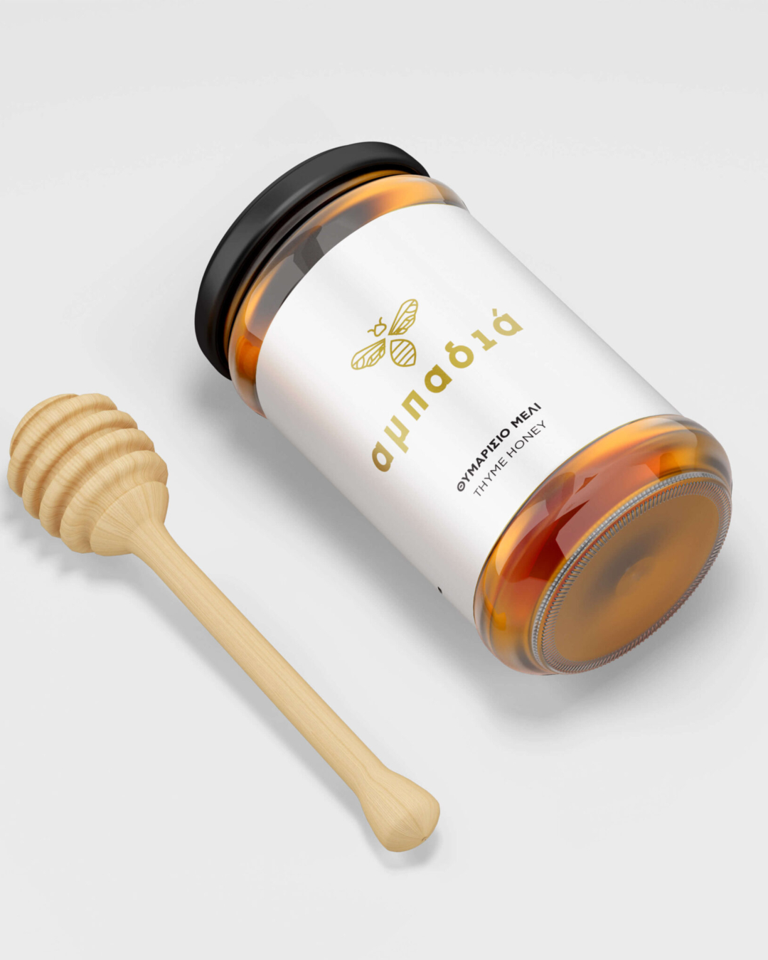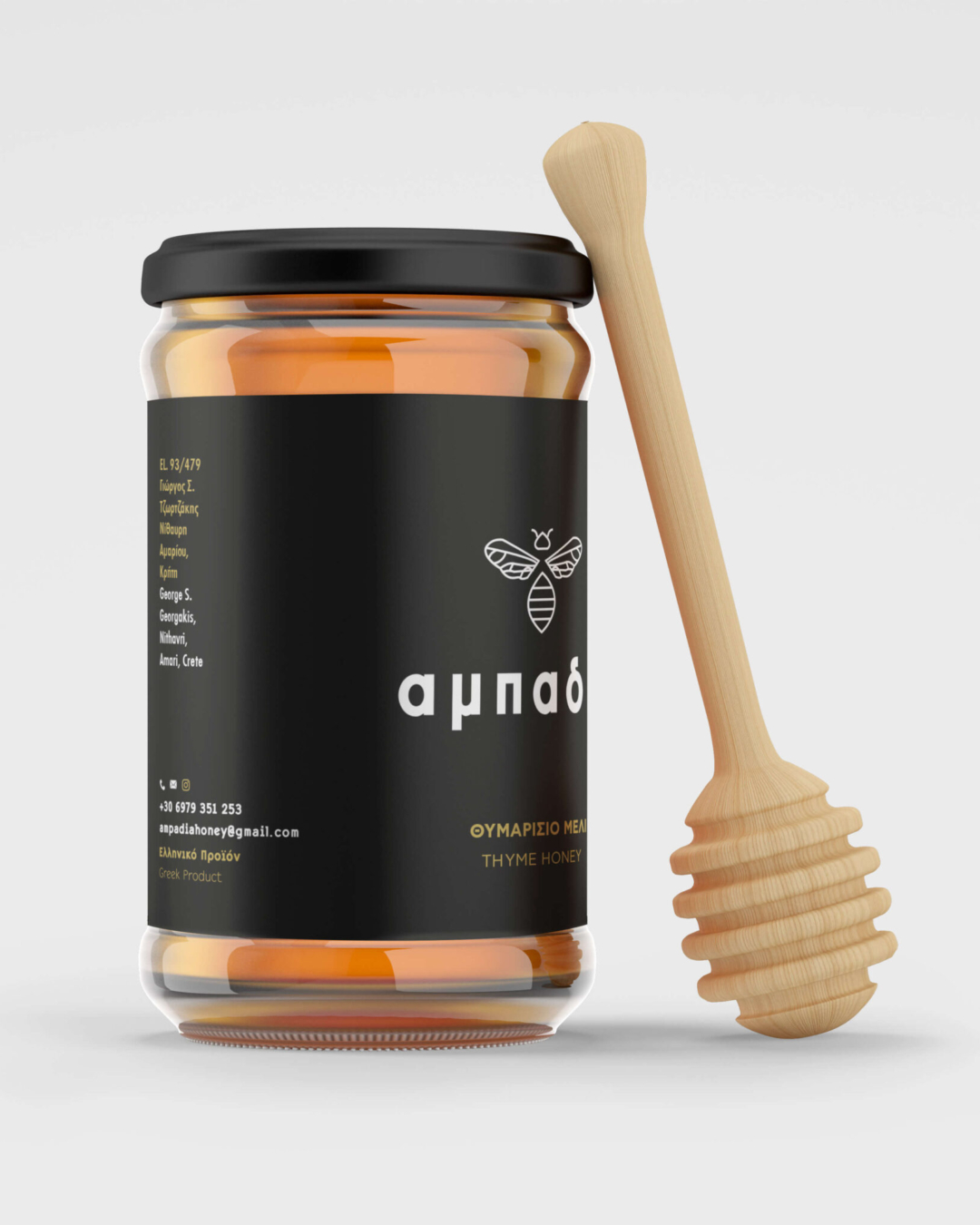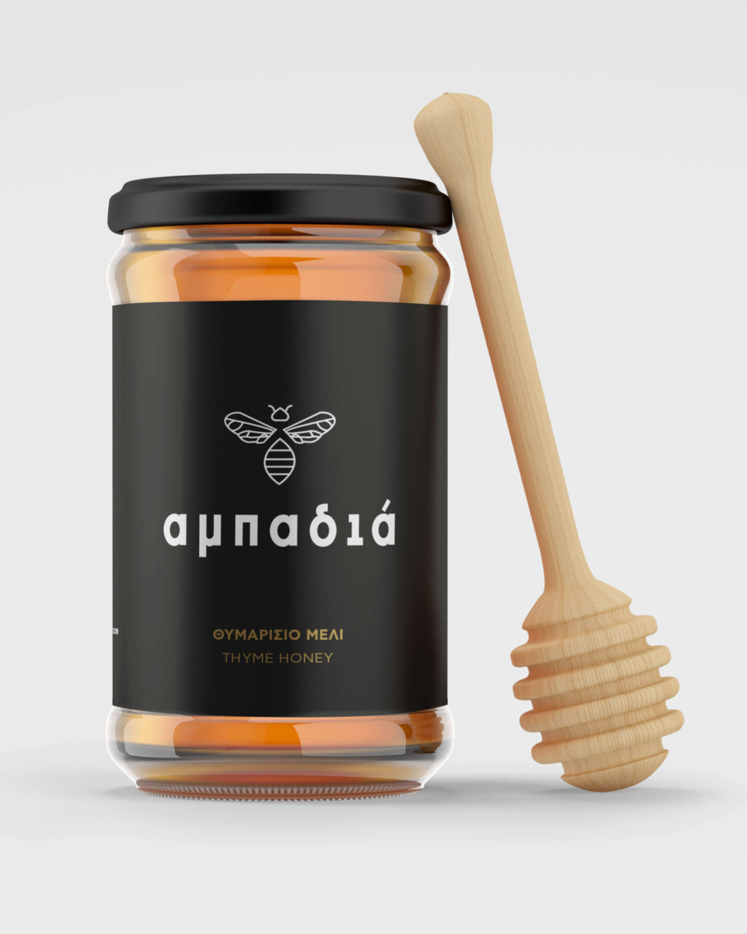 Μέλι Αμπαδιά: Η ταυτότητα της επιχείρησης, καθώς και ο σχεδιασμός της συσκευασίας βασίζεται στην καθαρότητα. Ο abstract σχεδιασμός της μέλισσας σε συνδυασμό με τη φινέτσα της παλέτας λευκού, χρυσού και μαύρου αγκαλιάζουν την ποιότητα που προσφέρει το προϊόν.